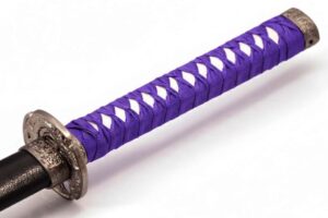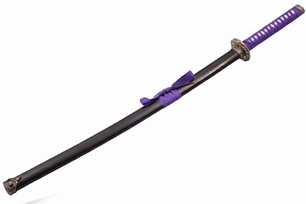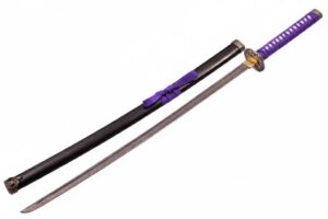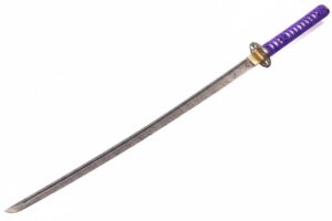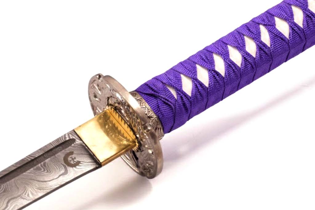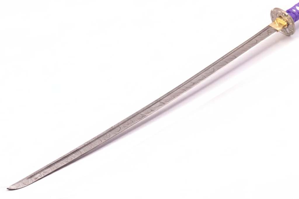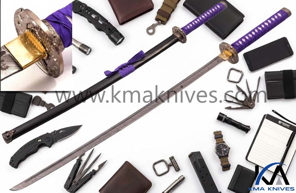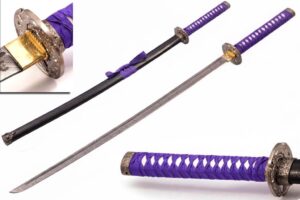 39.3″ HAND FORGED DAMASCUS STEEL KATANA SWORD WITH BLACK SCABBARD AND TSUBA DETAILING.